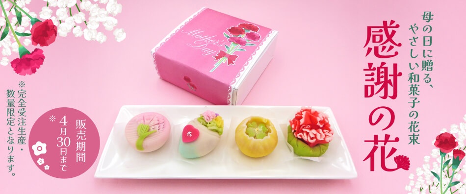 【完全受注生産】母の日限定ギフト予約開始のお知らせ 2026-03-27 5月10日は母の日。 紋蔵庵では今年は母の日の贈り物に、職人が一つひとつ丁寧に仕上げた上生菓子の詰め合わせをご用意いたしました。 やさしい色合いのカーネーションや、花束をイメージした意匠、幸せを運ぶ四つ葉のモチーフなど、それぞれに「感謝」と「想い」を込めた四種の上生菓子です。 繊細な練り切りの美しさと、季節を映した彩りは、目でも心でもお楽しみいただけます。 日頃の感謝の気持ちを、和菓子にのせて。 大切な方へ、やさしいひとときをお届けいたします。 【オンライン限定】母の日ギフト「感謝の花」