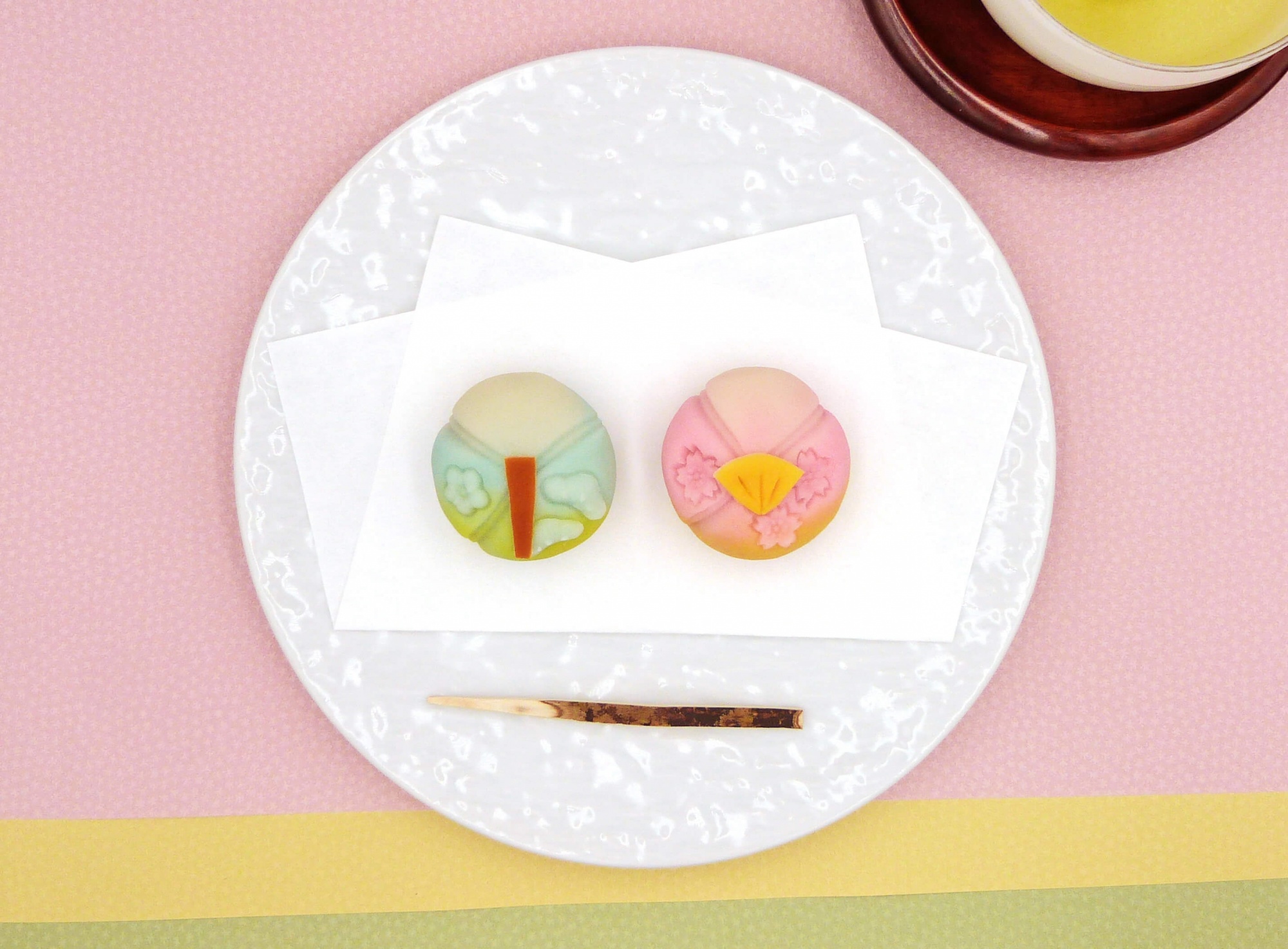 ころんと愛らしい手まりのかたちに仕立てた、おびな・めびなの上生菓子を二つ一組にしました。